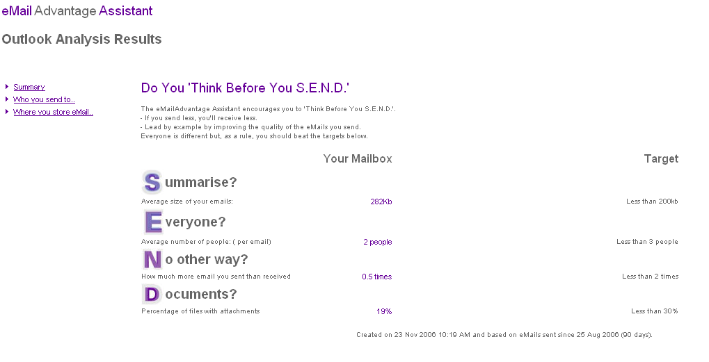 Well, in my morning cup of tea, email sending web browsing session I stumbled across this - eMailAdvantage tool which I thought would be fun to run on my Outlook and see what it came back with.