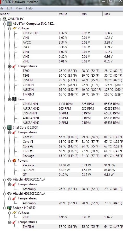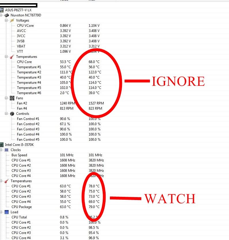 Okay, if you are getting 100 deg plus where i have marked ignore, then ignore them, as you can see in the image from my cupid monitor a few posts earlier you will see my cpu and aux temps hitting 127 deg. this is because of ai suite, until I removed ai suite totally i never got the correct readings. you can tell they are false as your minimum temp is 2 which is 99.9% impossible if your room temp is is above 2 degs.