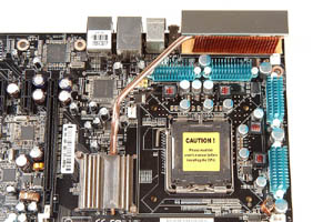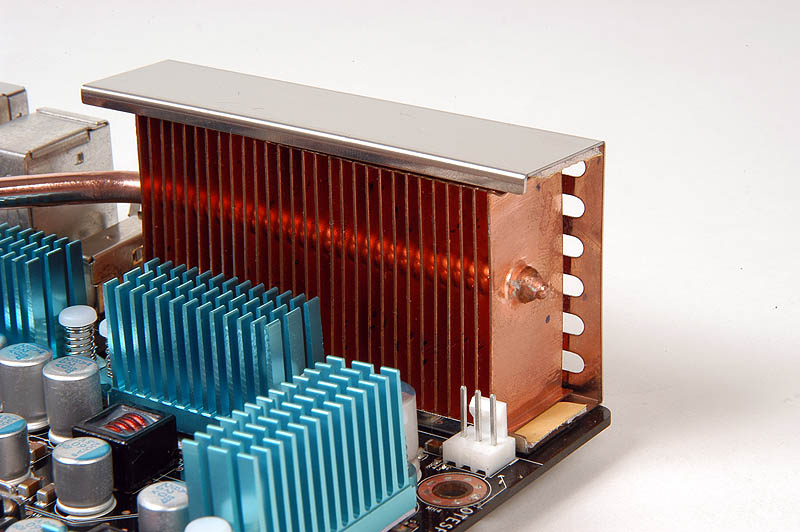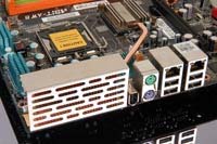 This looks like a clever idea, as most CPU socket areas are designed to be cooled by the "blowoff" from a CPU HSF anyway. However, I am concerned that the grille at the back of the board might inhibit airflow through the collection module. The fins on the collection module are not packed very densely, presumably so that air can pass through them without too much resistance, so why put a restrictive grille in the way? Of course, this is just my first impression, and only testing will reveal whether or not this is actually an issue.