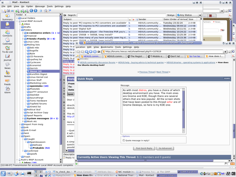The different desktops have different looks. Note how mine has an Icon bar for example. There are also different default programs, so my web browser is Konqueror instead of Galeon, and my messaging program is Knotact instead of Evolution, though there is nothing to stop you using a program from another desktop instead, for example I used GIMP (a Gnome program) to take the screenshot, as I am more familiar with it.